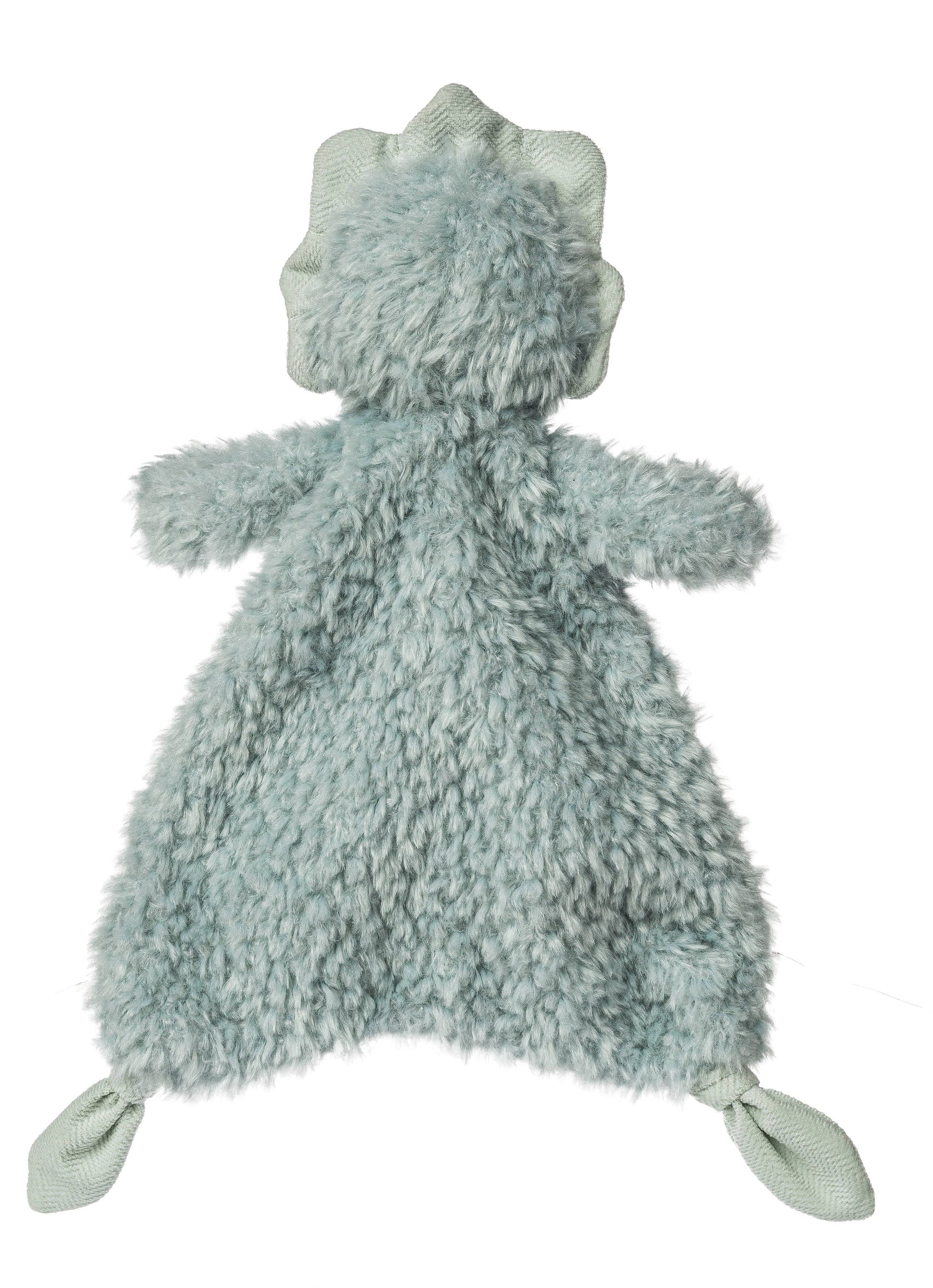 SOFT TOY LOVEY: Dinosaur is a comforting cuddle toy with an under-stuffed body in textured blue fabric with knotted corners at the feet; lovey has a soft sculpted face with embroidered eyes.