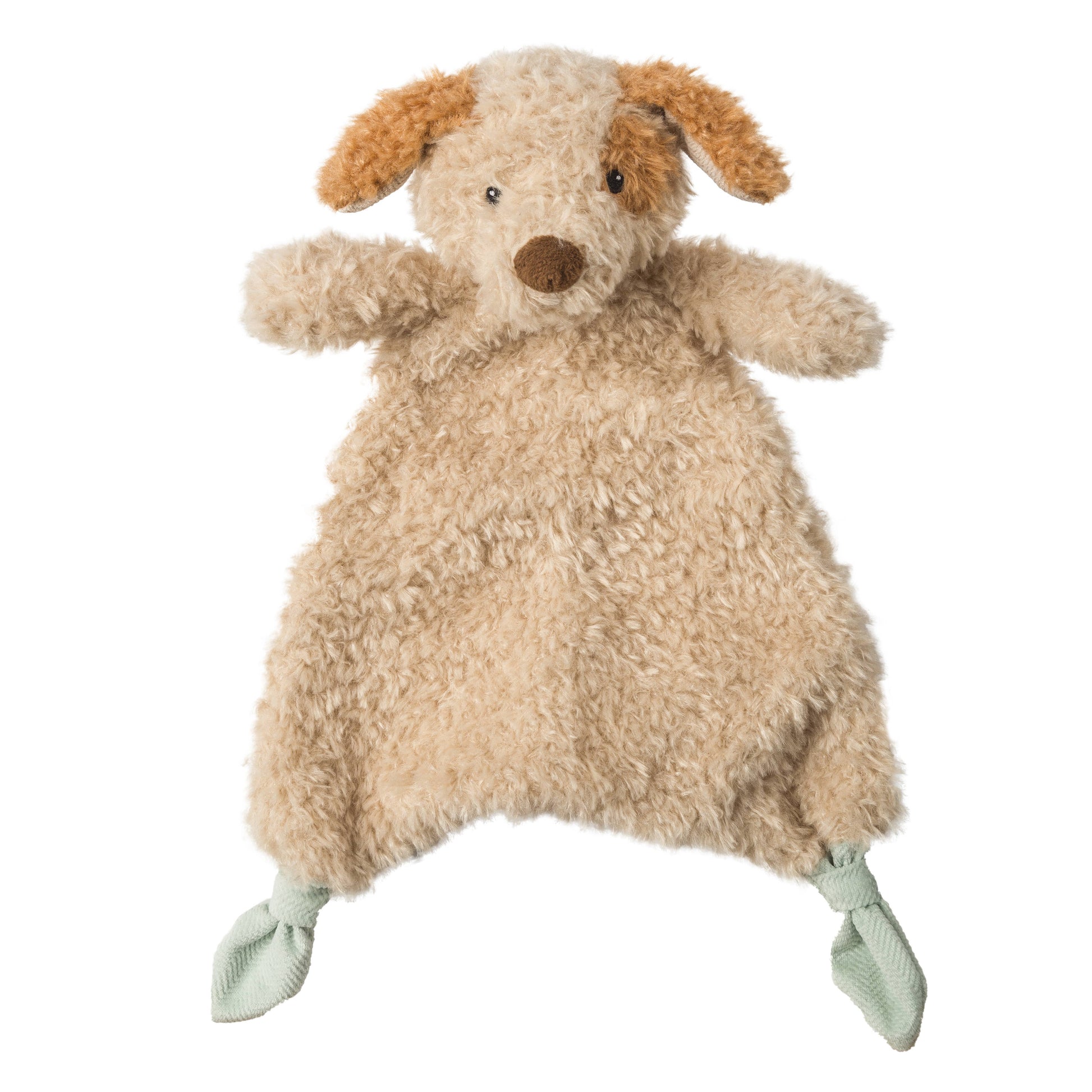 SOFT TOY LOVEY: Puppy is a comforting cuddle toy with an under-stuffed body in textured white fabric with knotted corners at the feet; lovey has a soft sculpted face with embroidered eyes.