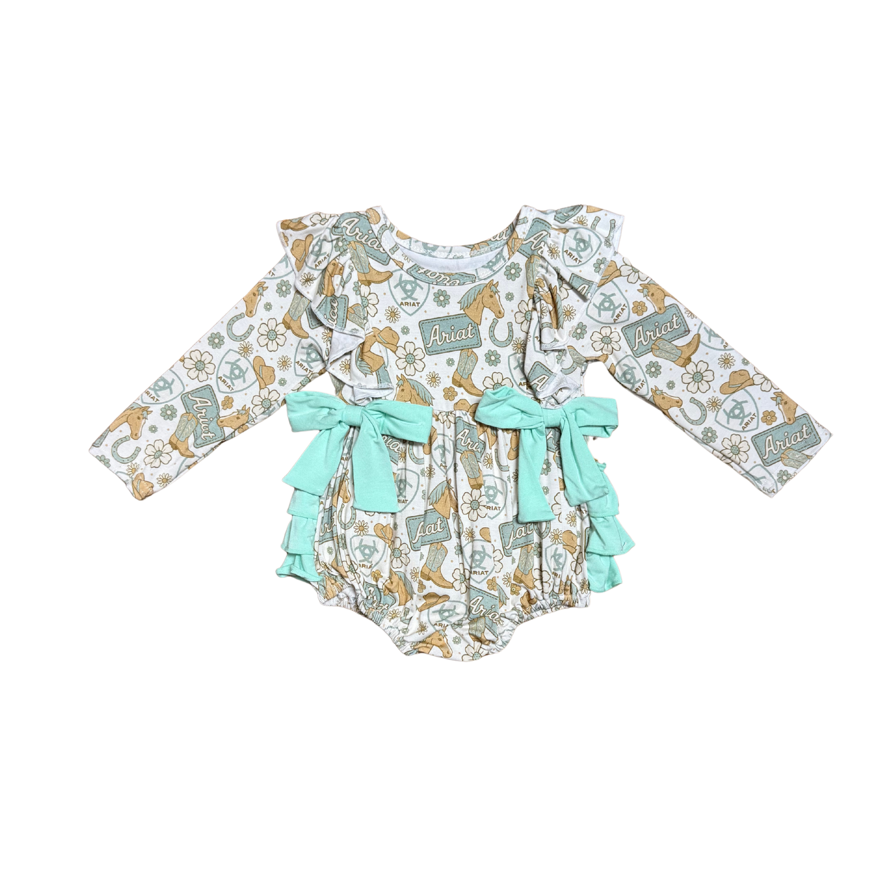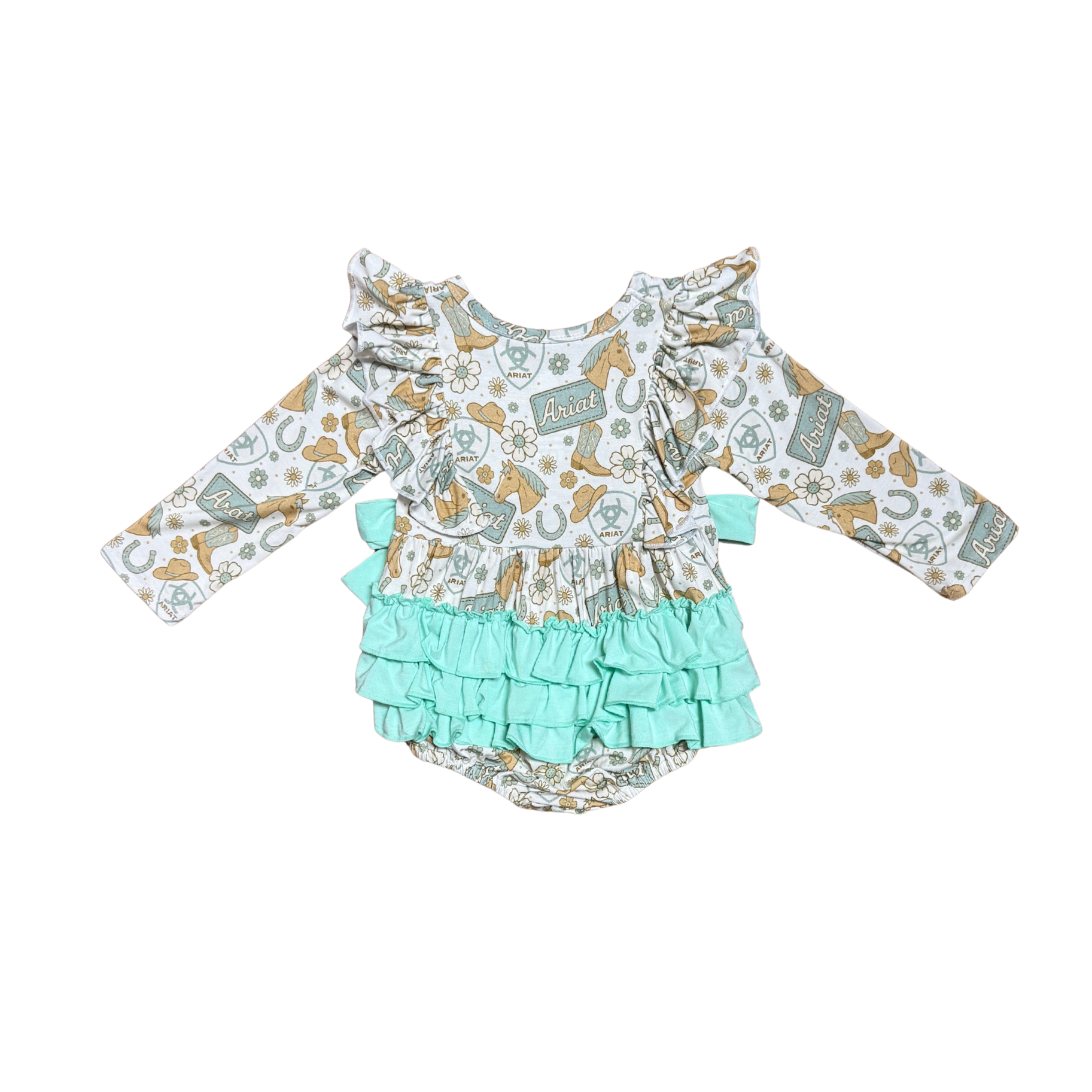 Let your little equestrian steal the show in this adorable Ariat Bamboo Bubble Romper! Designed with horse-loving kids in mind, this playful one-piece features a charming ruffle butt detail that's as fun as a day at the barn. Crafted from soft, breathable bamboo fabric, it keeps your kiddo comfortable whether they're playing pretend or heading to the stables. Perfect for playdates, casual outings, or showing off their love for all things horses!