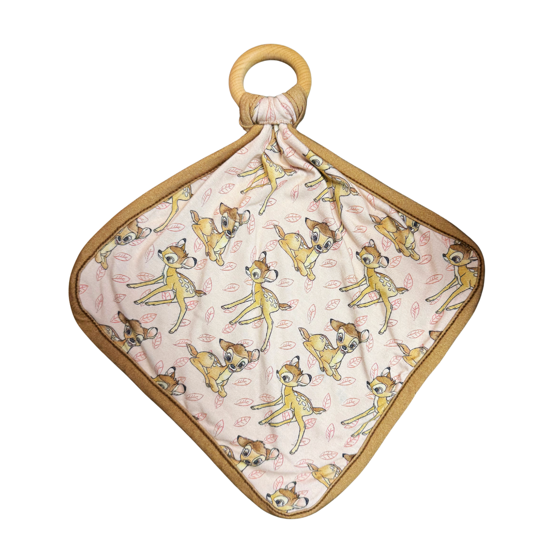 Our lovey is a mobile and attachable mini security blanket, made from the same material as our beloved rompers. It comes with a detachable ring made from all-natural beech wood to relieve teething symptoms. Polished to smooth perfection, the wooden ring has no treatment or coating so you can rest easy knowing your baby is safe. Easily unthread the ring and attach the lovey to baby’s pacifier, teether, toy, or our ring sling!