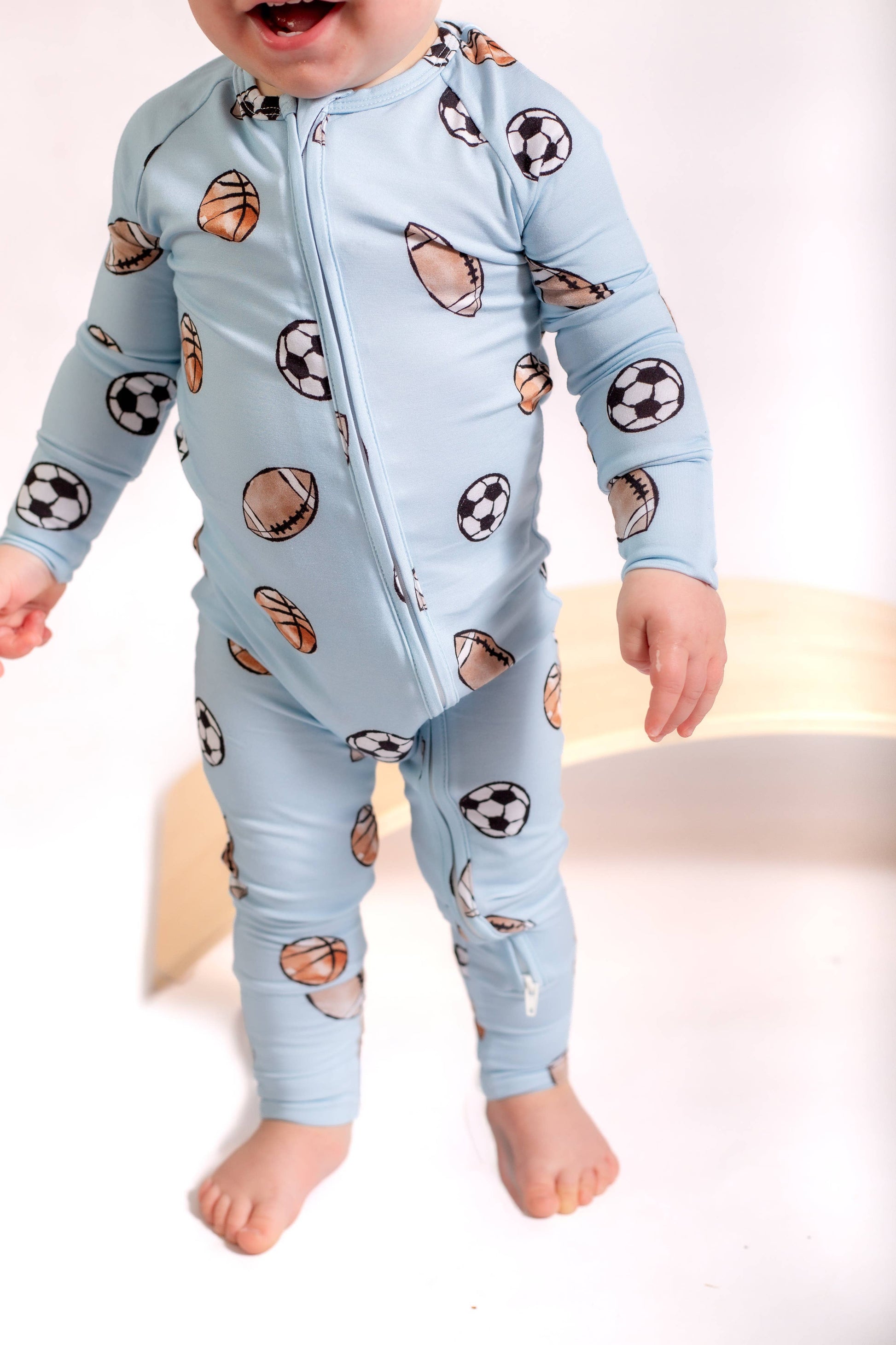 Sports Bamboo Zipper Romper Your little one will be extra cozy and cute in our Bamboo Zipper Romper! Made from buttery-soft, breathable bamboo fabric, this charming romper features an adorable blue sports print, perfect for your little one.