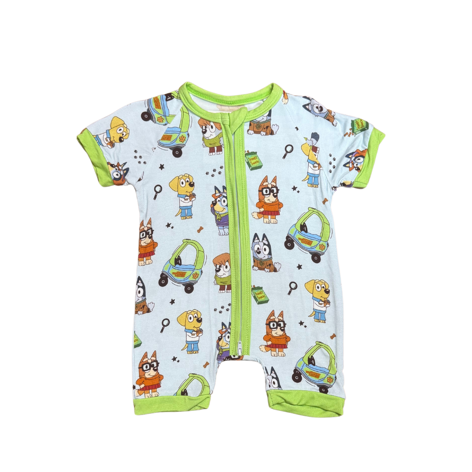 Get ready for some playtime fun with our Bluey-Dooby Doo Bamboo Short Romper! This adorable romper features Bluey dressed up as the famous Scooby-Doo characters, perfect for imaginative adventures. Made with soft and sustainable bamboo fabric, your little one will be comfy and stylish all day long. Zoinks!