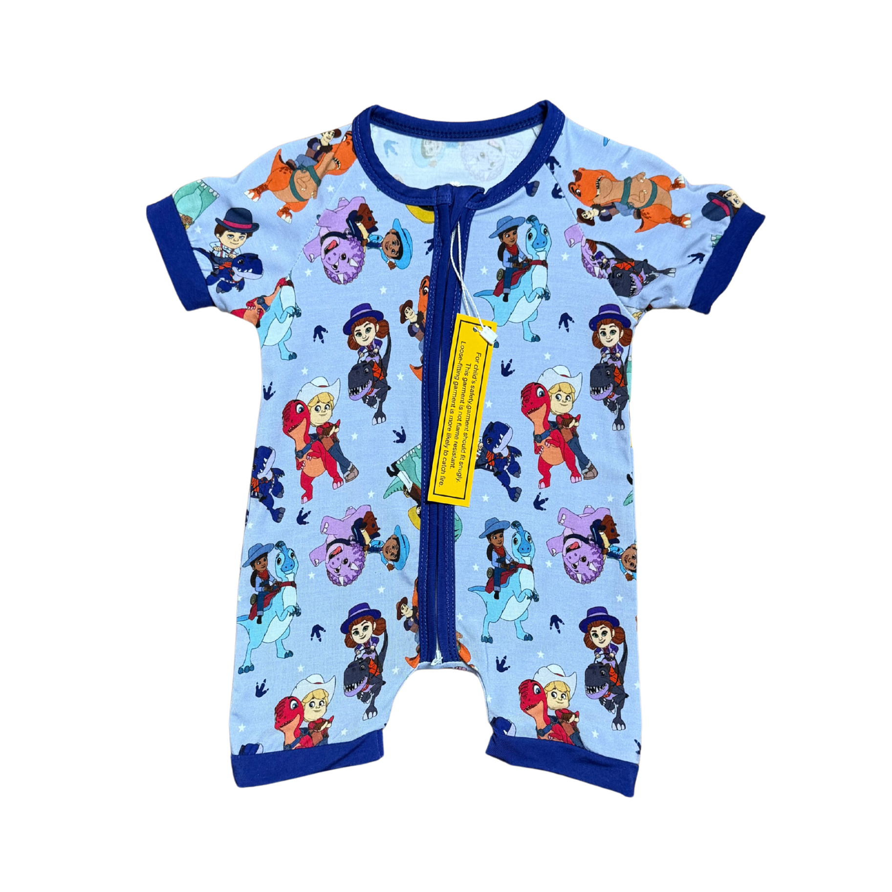 Let your little dino wrangler roam free in this adorable Dino Ranch Bamboo Short Romper! Inspired by the beloved cartoon, this playful one-piece features fun dino-themed graphics that'll have kids grinning from ear to ear. Crafted from soft, breathable bamboo fabric, it's gentle on sensitive skin and perfect for active adventures—whether they're herding imaginary dinosaurs or just playing in the backyard. Easy to slip on and comfortable all day long, this romper is a must-have for any Dino Ranch fan!