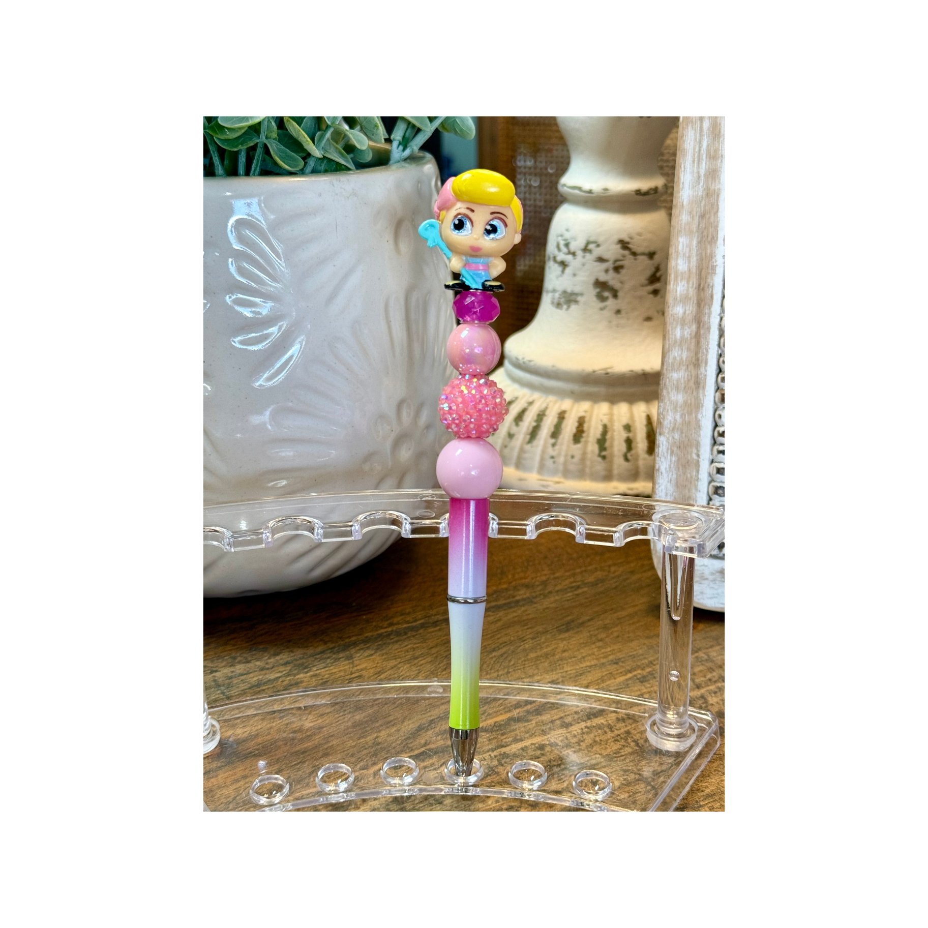 All pens are plastic ballpoint pens with black refillable ink, retractable by twisting. All pens are adorned with fancy beads inspired by your favorite Disney characters and topped with a Disney Doorable.