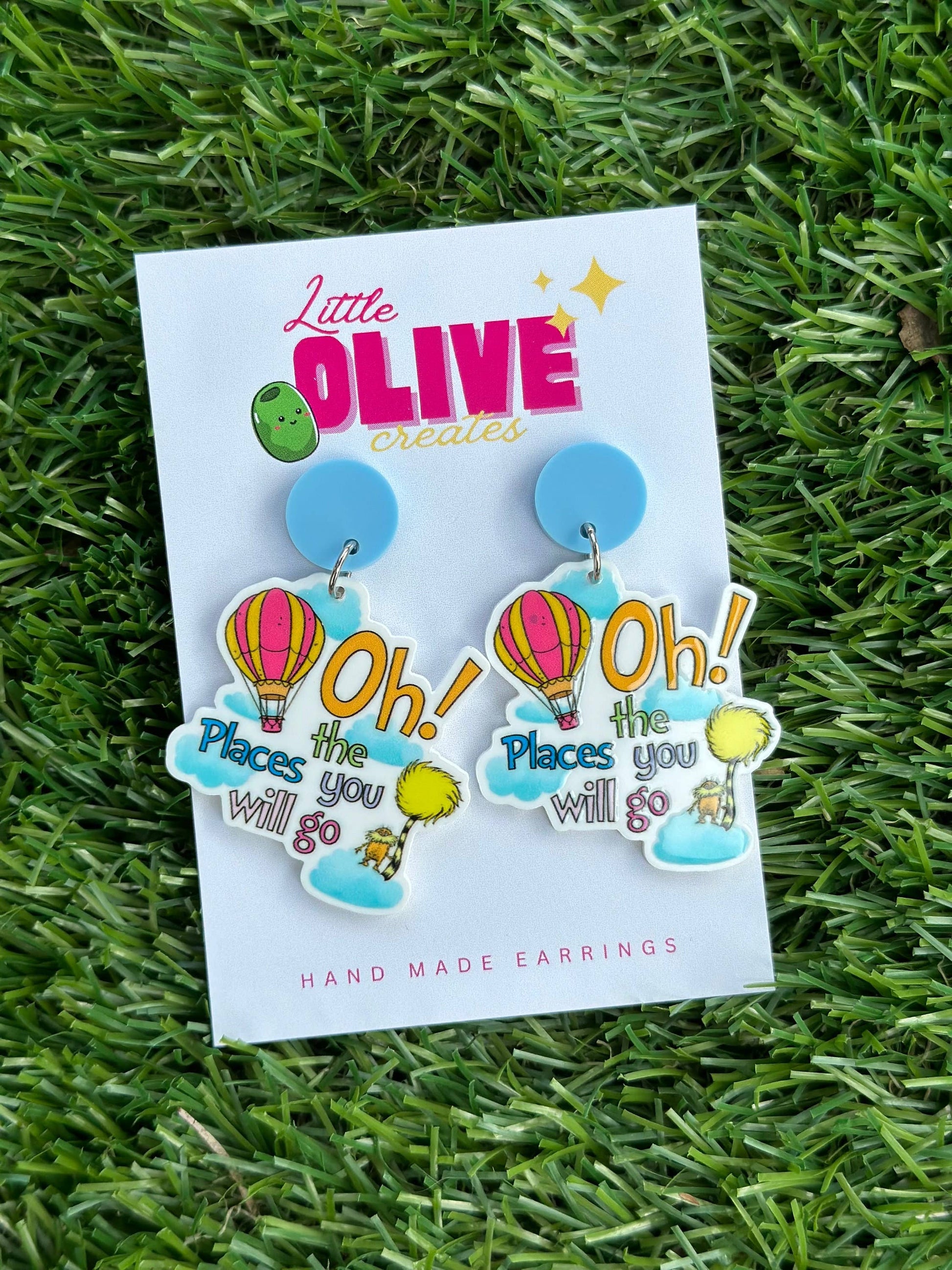 Embark on a Stylish Adventure with Dr. Seuss 'Oh The Places You'll Go' Dangle Earrings! Celebrate Book Week in whimsical fashion with these delightful earrings inspired by the beloved Dr. Seuss classic. Featuring stainless steel hypoallergenic posts, these earrings offer both style and comfort. Dangle Size approximately 50-60mm with a stud top of 15mm, making them the perfect accessory for any literary enthusiast. Add a touch of literary charm to your ensemble and let your imagination soar with these charming earrings!