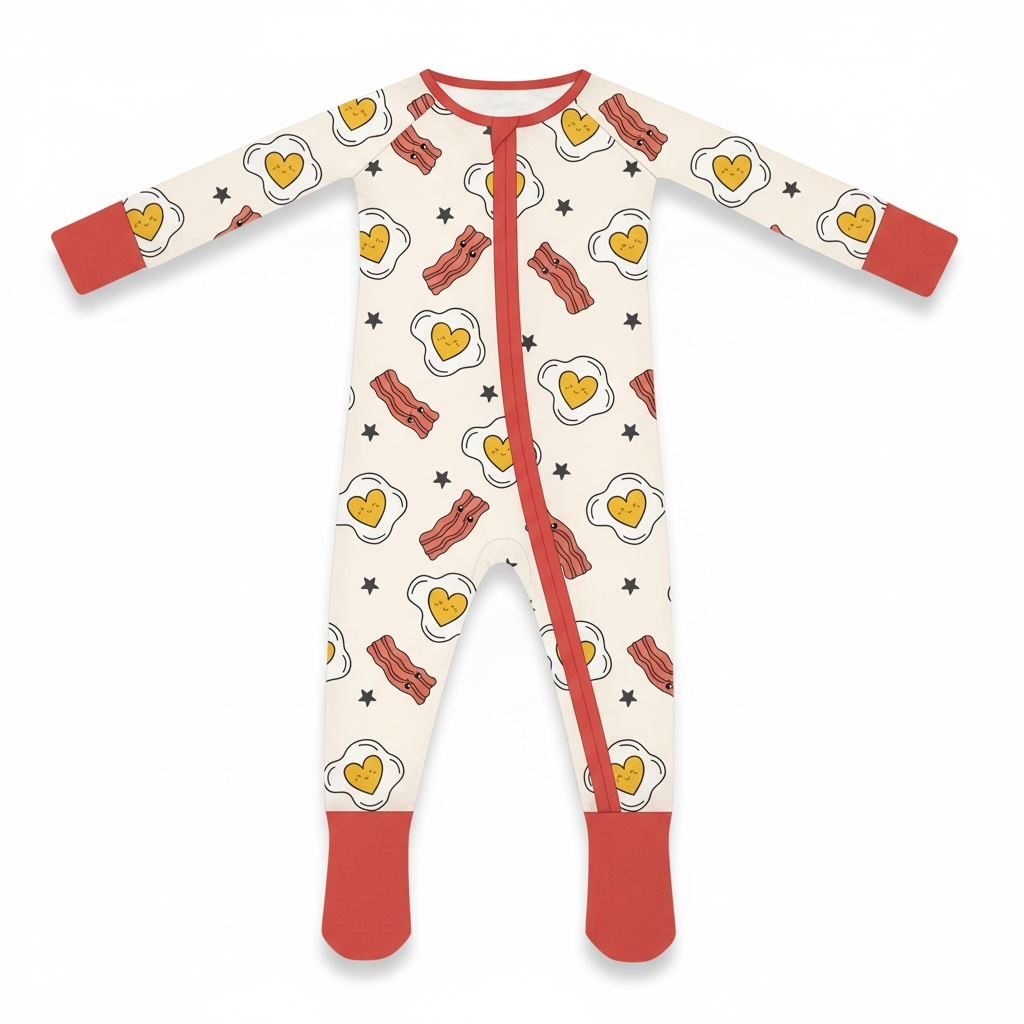 Breakfast Bamboo Zipper Romper Your little one will be extra cozy and cute in our Bamboo Zipper Romper! Made from buttery-soft, breathable bamboo fabric, this charming romper features an adorable eggs & bacon print, perfect for your little one.