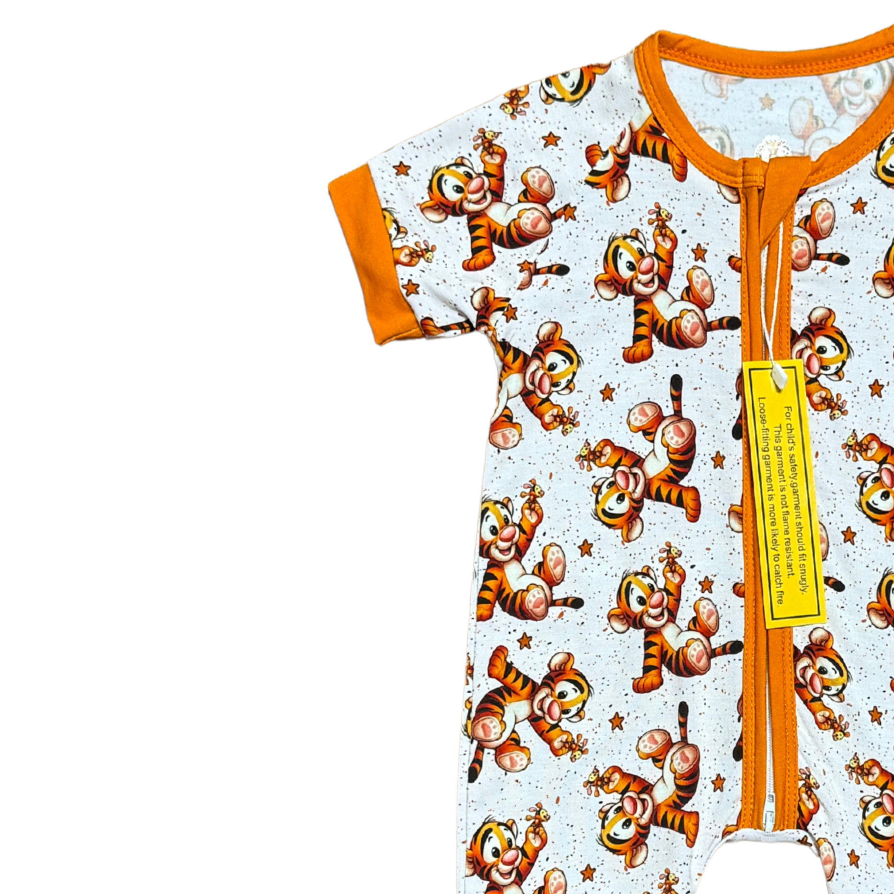Bounce into fun with our Little Bitty Tigger Bamboo Short Romper, inspired by everyone's favorite bouncy friend from the Hundred Acre Wood! This cheerful romper features Tigger's signature orange and black stripes in soft, breathable bamboo fabric that's gentle on sensitive skin. With a playful design that captures Tigger's energetic spirit, your little one will be ready for all their adventures. Perfect for fans of classic storybook characters and cozy comfort!