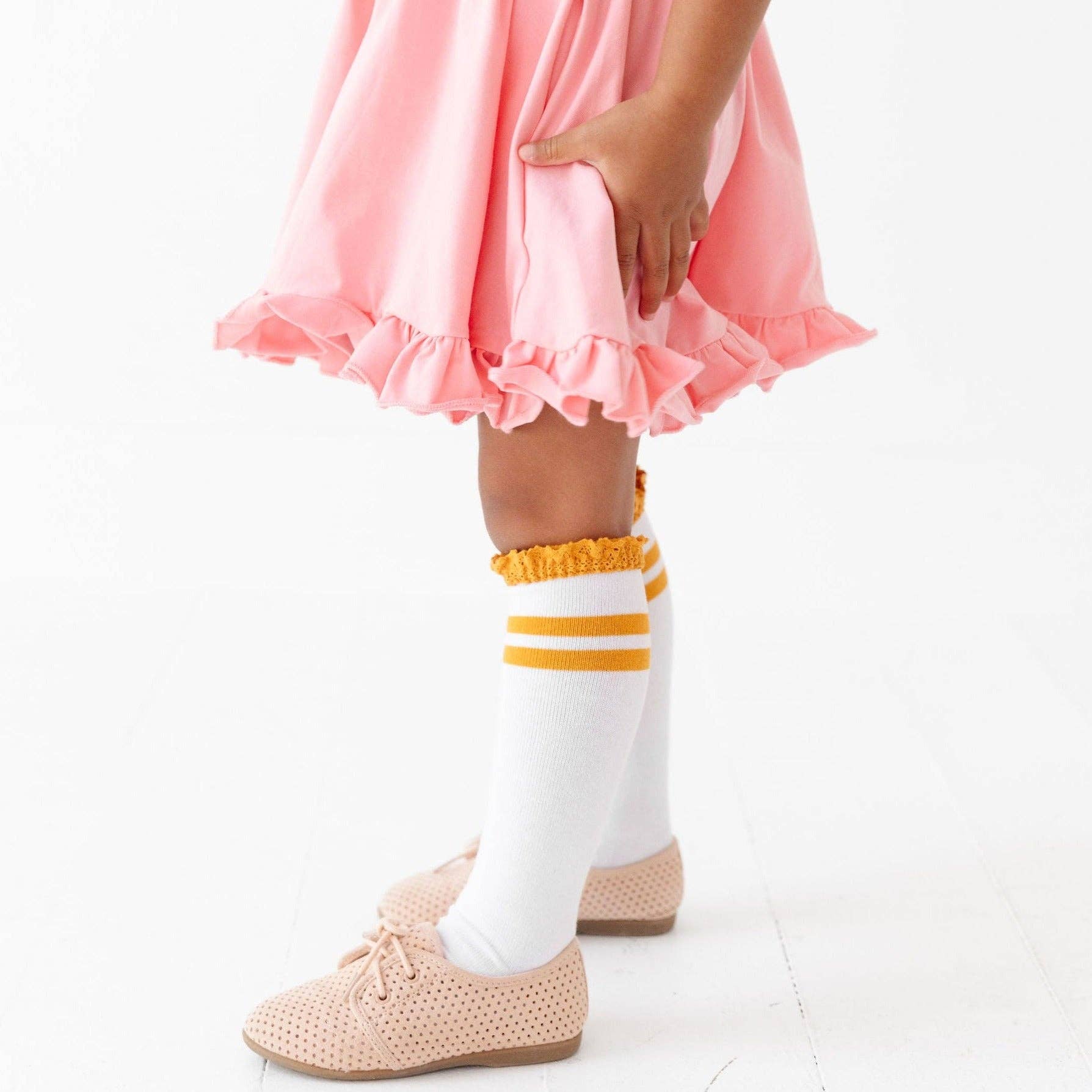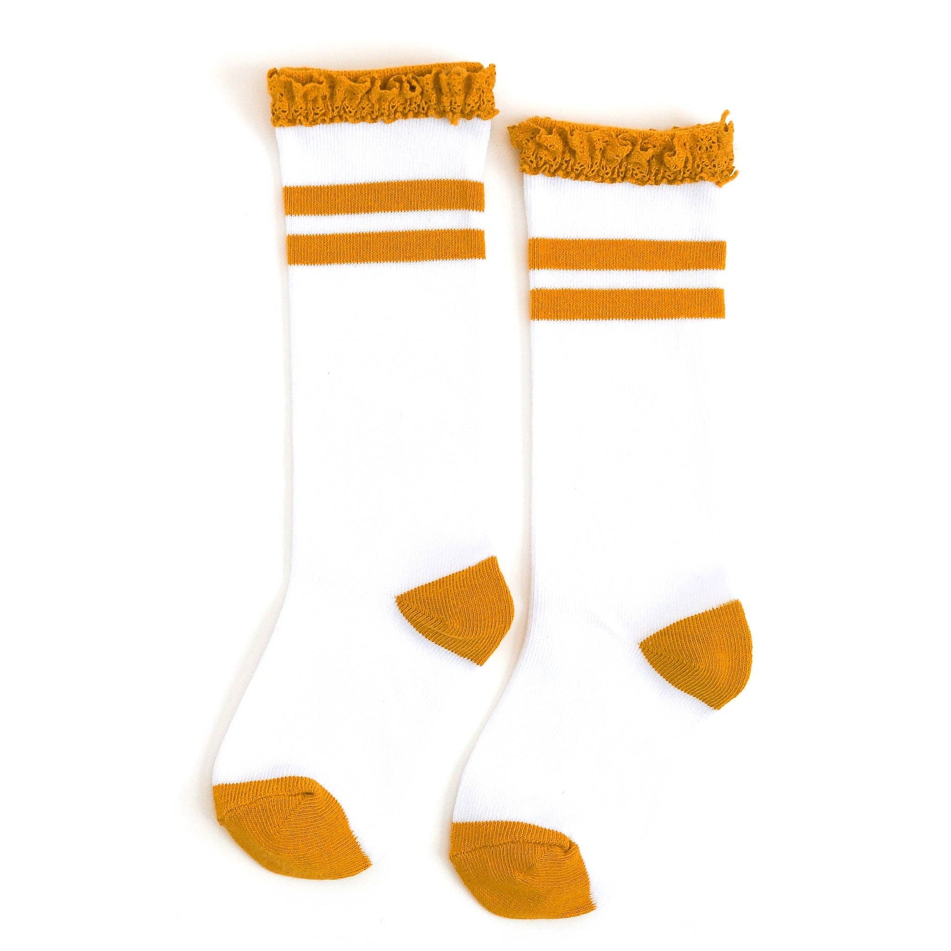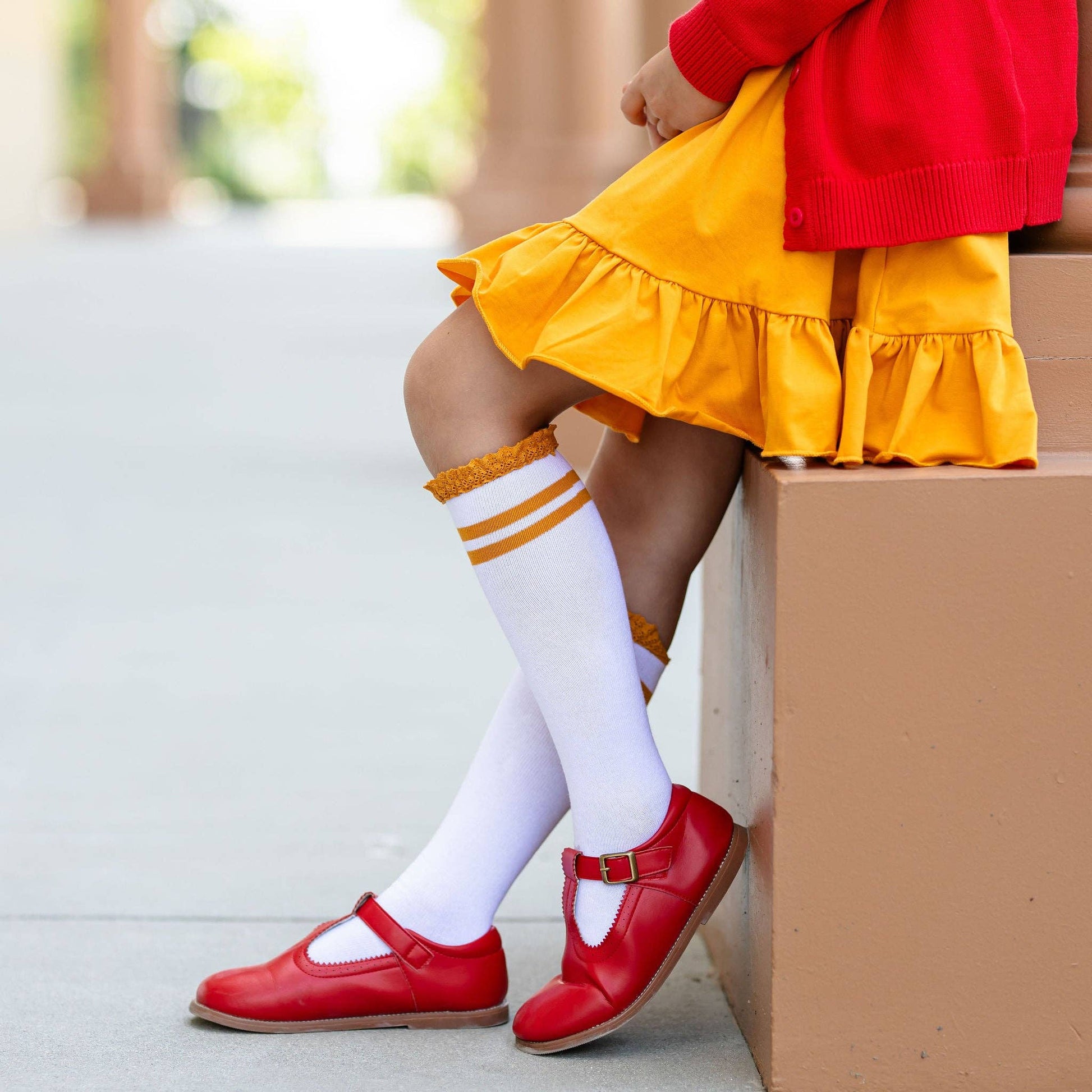 Marigold Striped Lace Top Knee Highs Our lace top knee high stockings are a fan favorite! And for good reason! Perfect for all seasons and styles- with the sweetest lace detail. We are certain they'll fit into your little one's wardrobe.