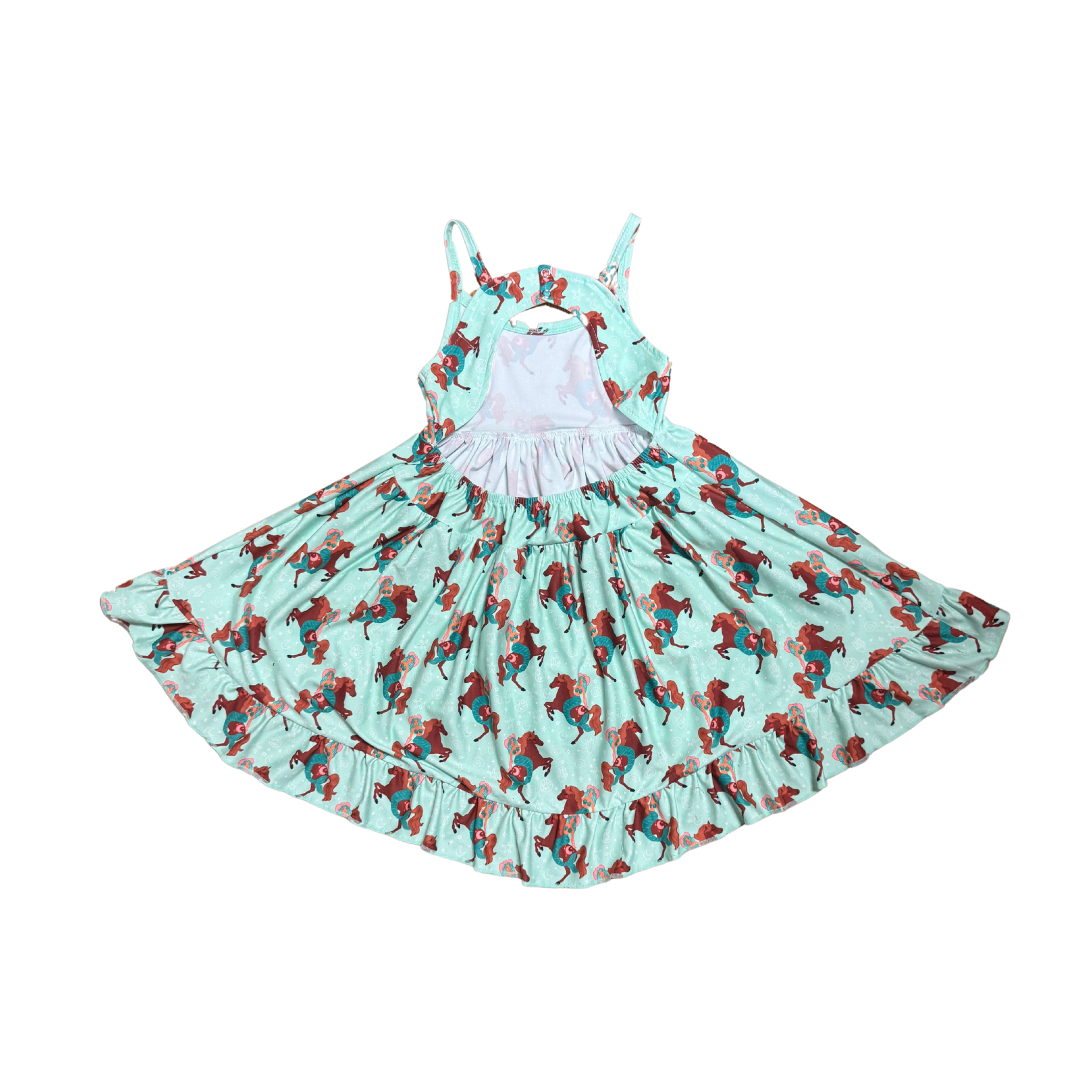 This Mermaid Cowgirl Twirl Dress combines the magic of the sea with the spirit of the Wild West. Designed for twirling fun, it features playful details that let every little cowgirl feel like a mermaid ready to dance under the stars. Perfect for parties, playdates, or any day she wants to shine with a splash of whimsy and a dash of country charm.