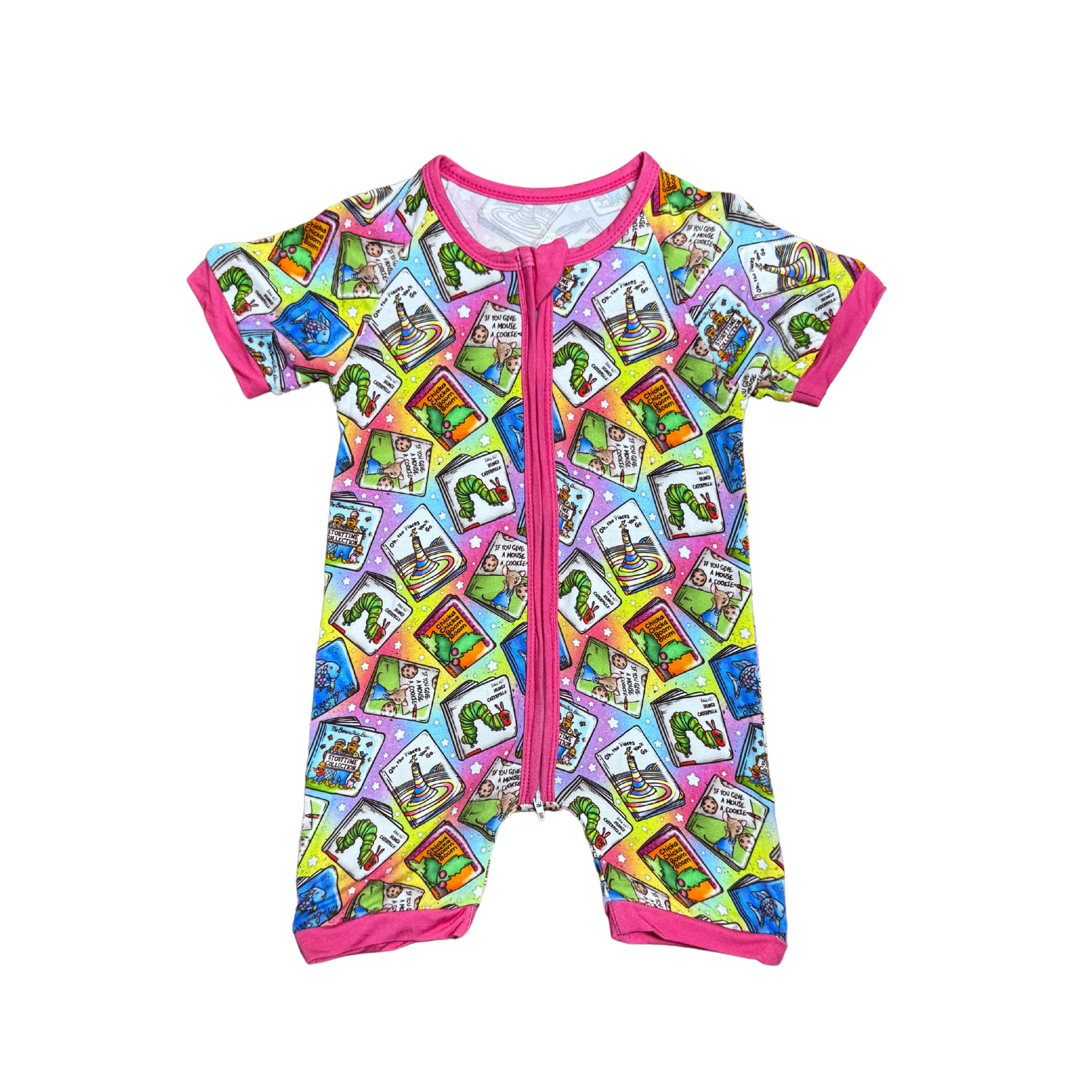 Celebrate storytime fun with the My Favorite Books Rainbow Edition Bamboo Short Romper! Featuring inspiration from classics like "Give a Mouse a Cookie," "Berenstain Bears," "Rainbow Fish," and "The Hungry Caterpillar," this romper wraps your little one in soft, breathable bamboo fabric. Its vibrant colors and playful design make every day feel like a new adventure in reading and imagination. Comfortable and cute, it’s perfect for your child’s next chapter of fun.