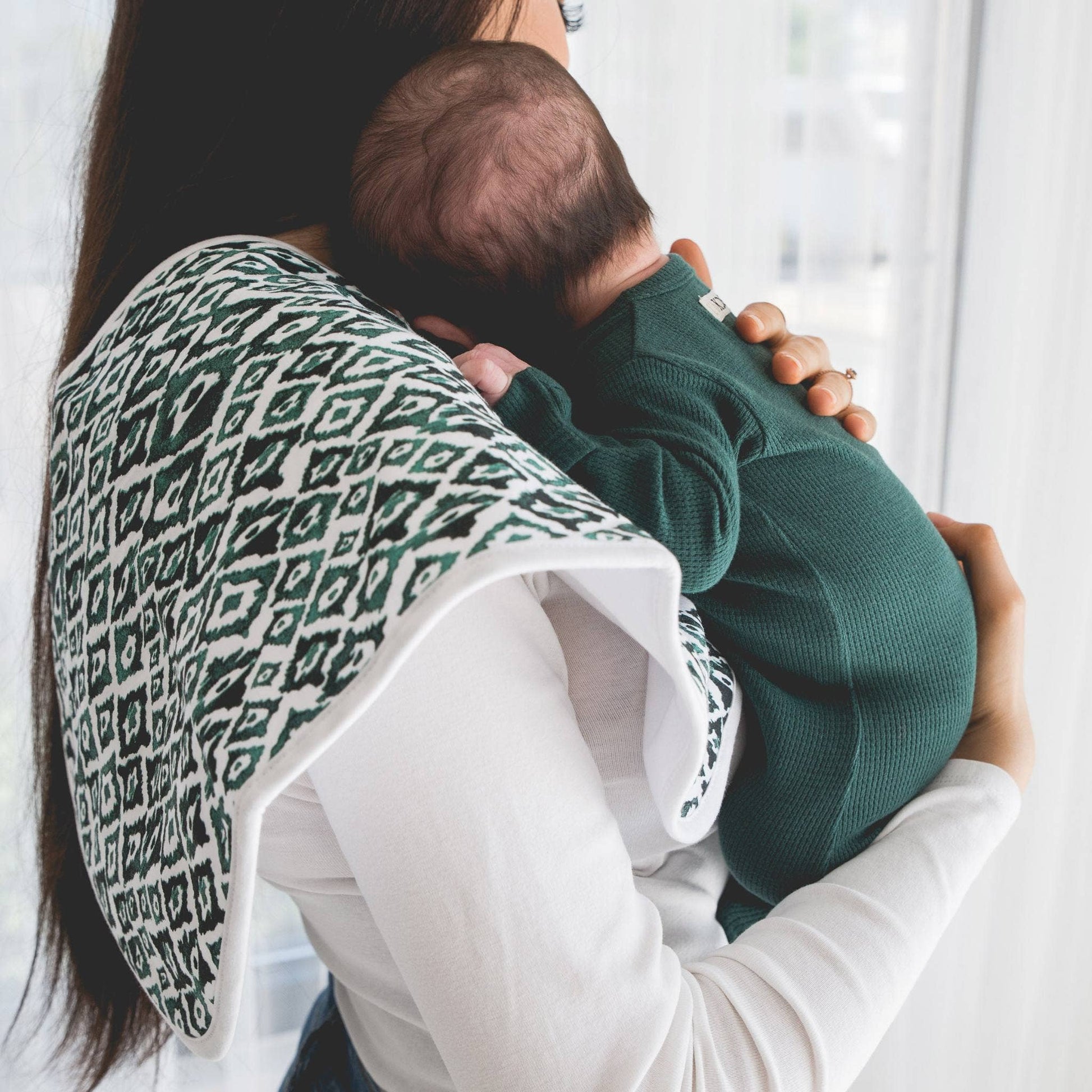 Our burp cloths are designed with baby’s comfort in mind. That’s why we created them with 100% ultra-soft cotton layers on the front (patterned) and back (plain white). You can feel confident that baby will feel cozy against your shoulder while burping.