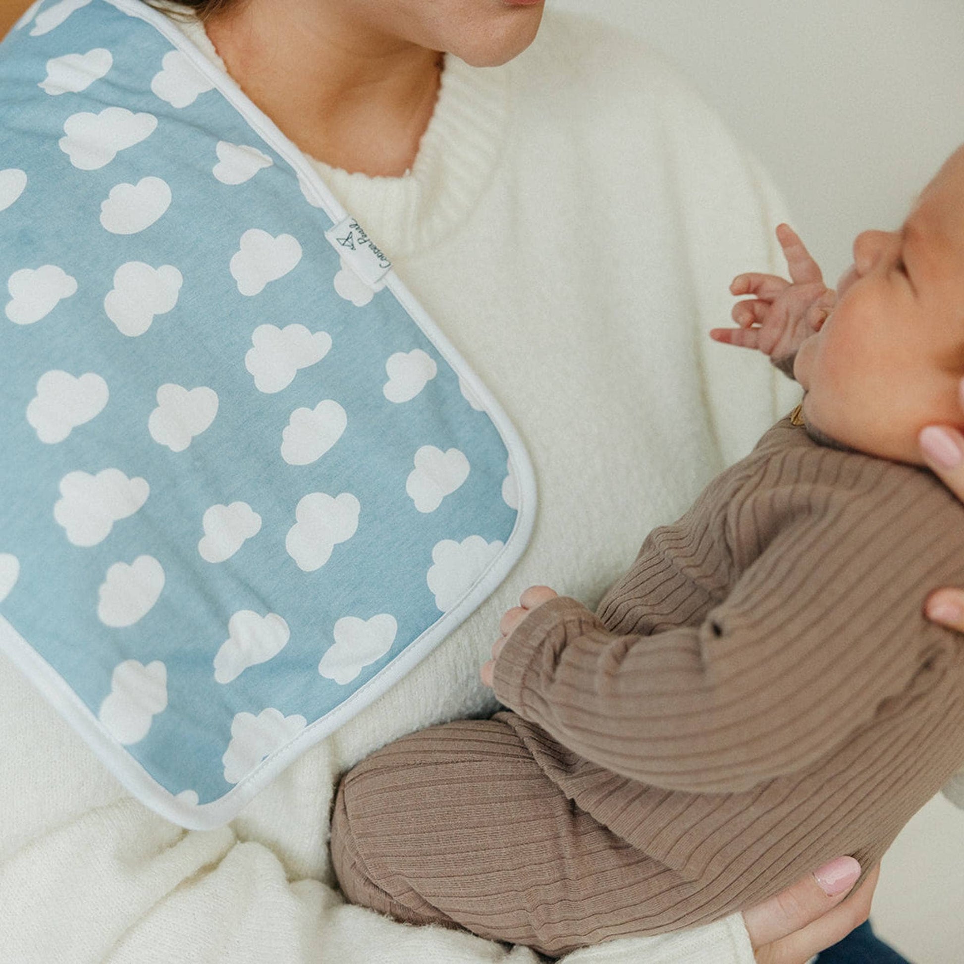 Our burp cloths are designed with baby’s comfort in mind. That’s why we created them with 100% ultra-soft cotton layers on the front (patterned) and back (plain white). You can feel confident that baby will feel cozy against your shoulder while burping.