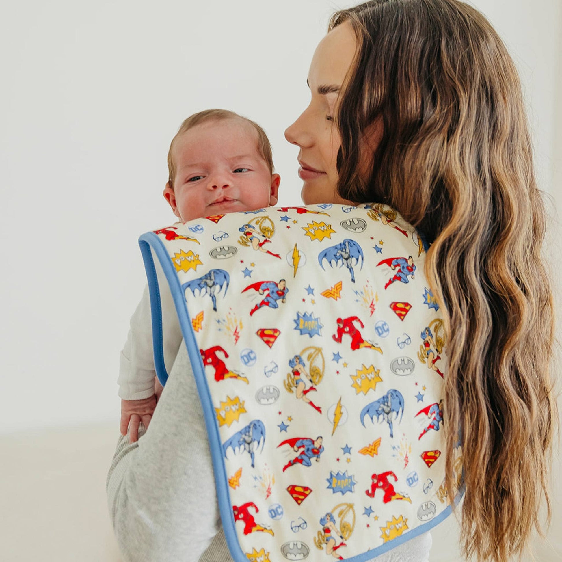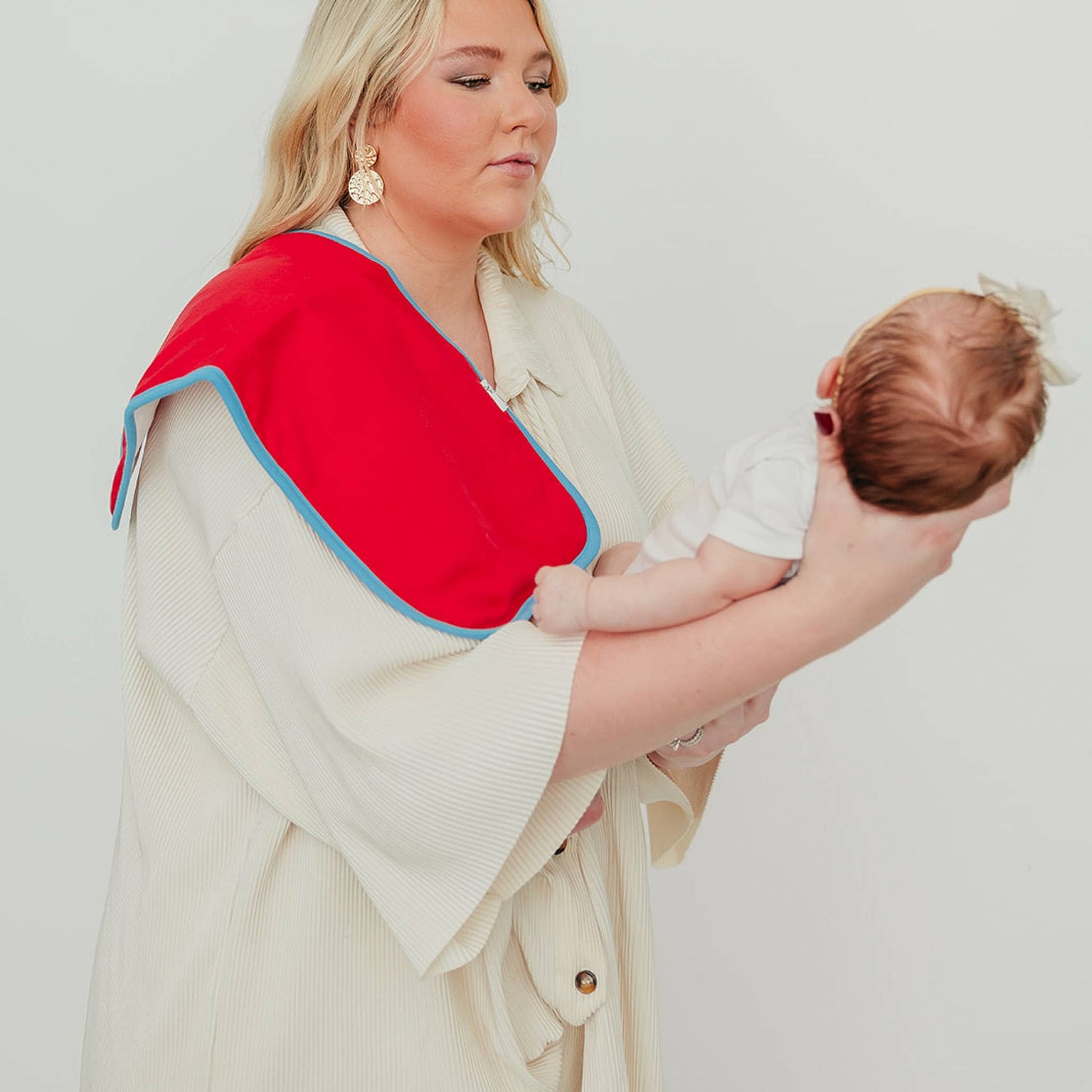 Our burp cloths are designed with baby’s comfort in mind. That’s why we created them with 100% ultra-soft cotton layers on the front (patterned) and back (plain white). You can feel confident that baby will feel cozy against your shoulder while burping.