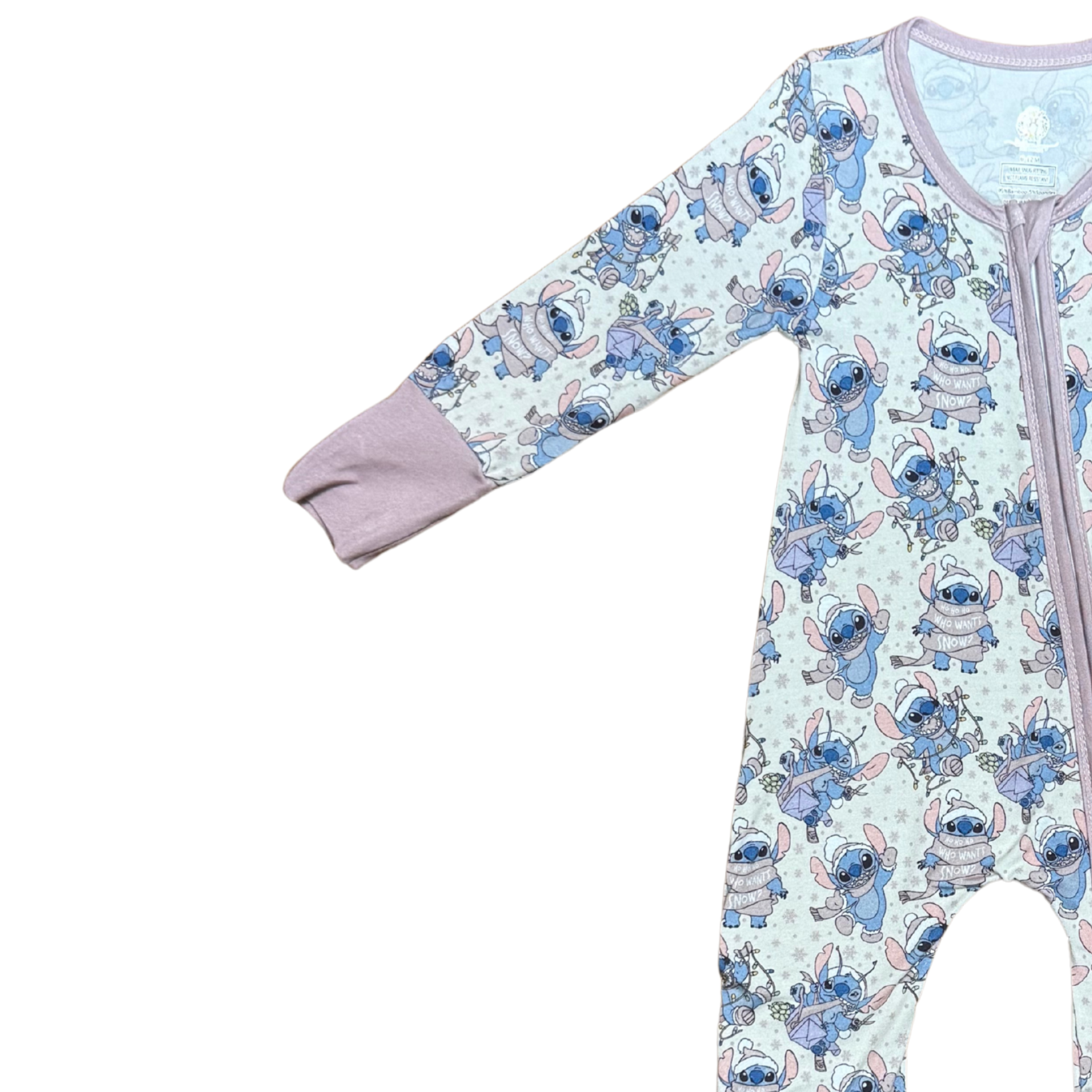 Watch your little one embrace the magic of winter in this delightful Stitch-inspired bamboo romper! Featuring everyone's favorite blue alien frolicking in freshly fallen snow, this cozy one-piece captures pure holiday joy. Crafted from soft, breathable bamboo fabric, it's gentle on delicate skin while keeping your child comfortable all day long. Perfect for festive photos, playdates, or snuggling by the fire—this romper brings Disney charm and winter wonder to your child's wardrobe.