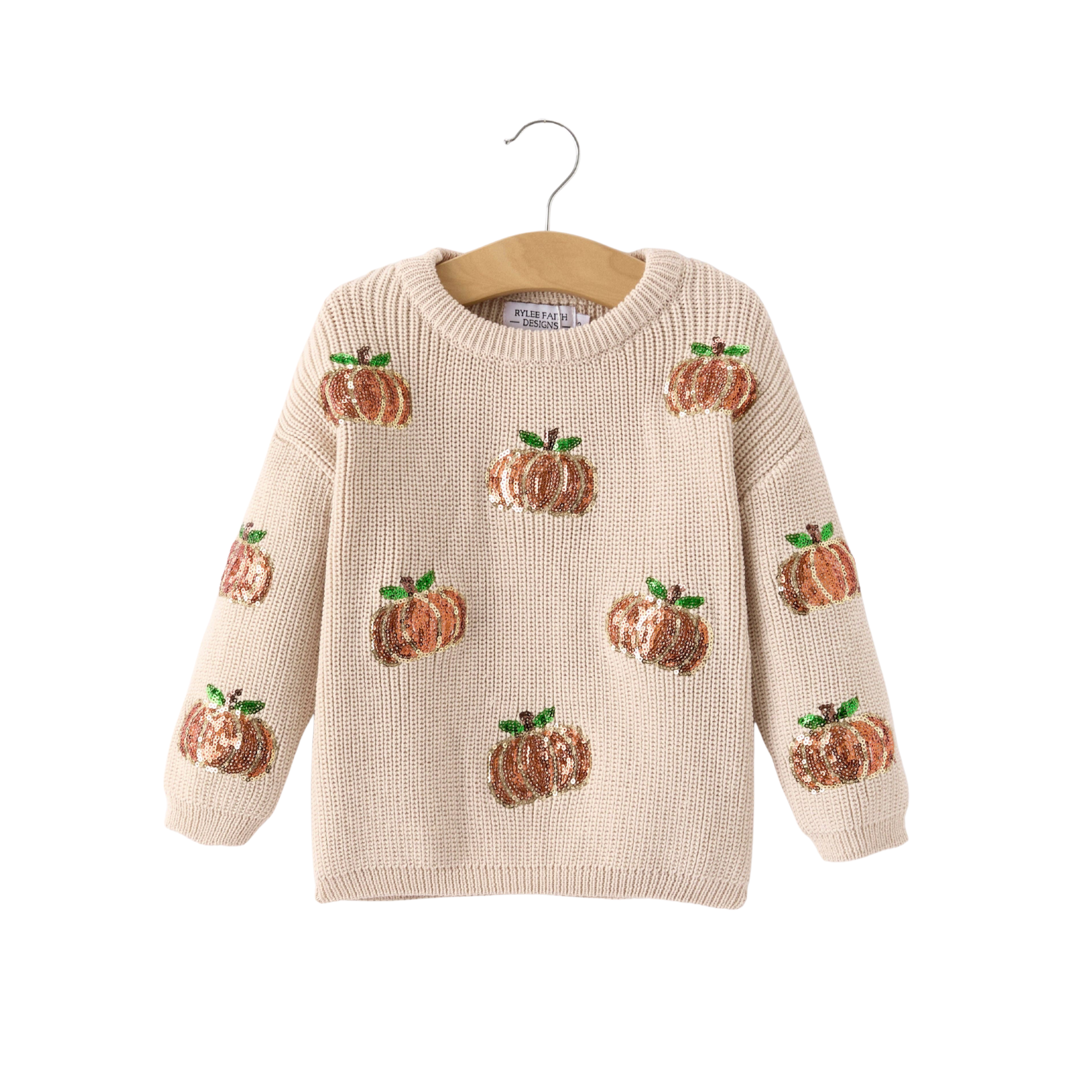 Celebrate fall in style with our Pumpkin Sequin Sweater in a cozy beige shade. This fun and festive sweater sparkles just enough to brighten your autumn days while keeping you comfortably warm. Whether layered or worn solo, its soft fabric and subtle shine make it a playful favorite for pumpkin patches, Halloween fun, or Thanksgiving get-togethers. Add a little sparkle to your seasonal wardrobe with this charming cozy essential.
