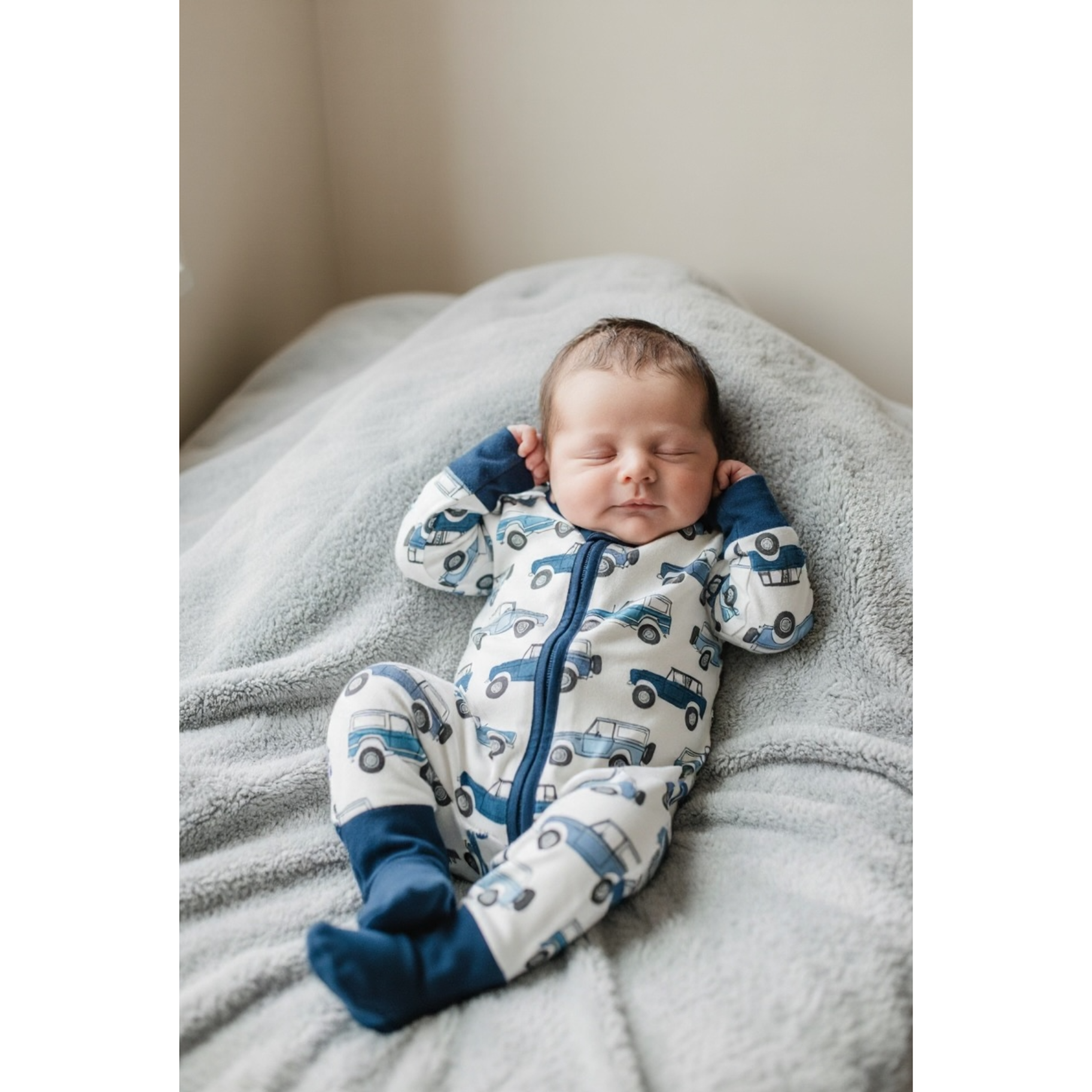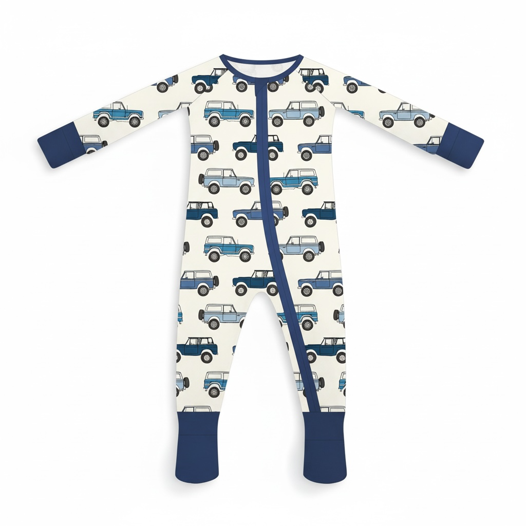 Vintage cars Bamboo Zipper Romper Your little one will be extra cozy and cute in our Bamboo Zipper Romper! Made from buttery-soft, breathable bamboo fabric, this charming romper features an adorable car print, perfect for your little one.
